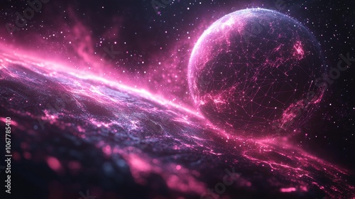 A purple glowing planet with a digital mesh grid and polygonal connections on a dark background. A futuristic visualization of technology, global data networks, and outer space.