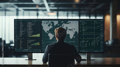 A quantified self enthusiast reviews data analysis techniques using multiple screens showing graphs, maps, and datasets in a modern office