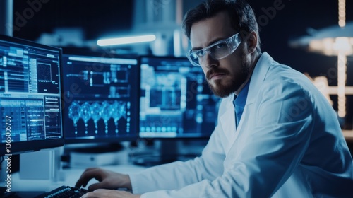 A quantum computer scientist performing quantum algorithm simulations, modern lab with quantum computers and data visualizations visible, High-tech style