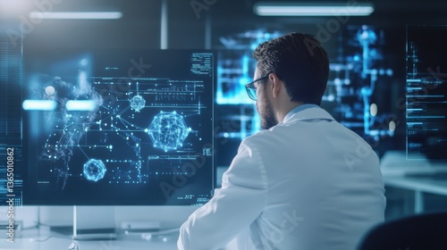 A quantum computing scientist designing quantum algorithms for faster cryptography, lab with quantum processors and encryption data visible, High-tech style