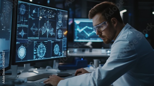 A quantum physicist analyzing data, futuristic laboratory with quantum computers and monitors displaying simulations in the background, High-tech style