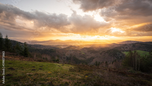 A rain shower passes over the Murg valley in the northern Black Forest during the golden hour