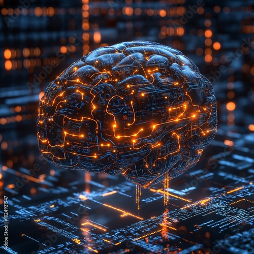 A realistic artificial intelligence (AI) brain made from digital circuits and glowing neural networks, set against a background of binary code. Generative AI