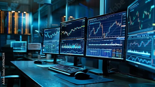 A realistic image of a graphical user interface showing stock trading algorithms, with detailed graphs and live indicators.