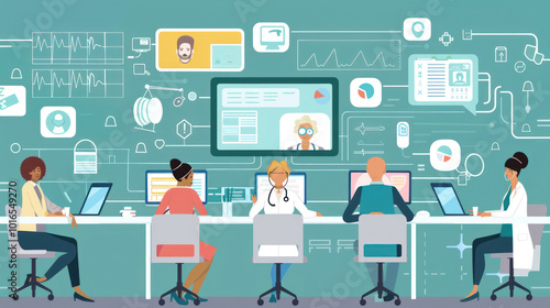A remote team of healthcare professionals collaborating on public health initiatives, using digital tools to coordinate outreach and patient education.