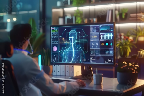 A researcher analyzing digital data on a futuristic monitor in a modern office setting, surrounded by greenery and tech elements.