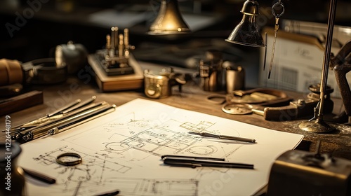 A retro engineer's table with a drafting set, old tools, and mechanical drawings.