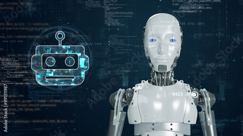A robot against a high-tech digital background and a glowing robot icon and binary code with artificial intelligence (AI) and robotics and highlighting futuristic technology