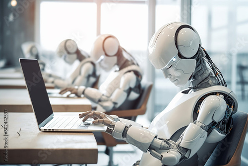 a robot humanoid android cyborg with artificial intelligence fell asleep while working at the computer