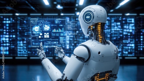 A robot interacting with a holographic display, controlling complex data systems in real time
