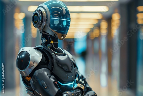 A robot is standing upright in a hallway, displaying its mechanical structure and technology