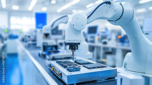A robot is working on a computer chip. The robot is white and has a blue arm. The robot is in a lab with other robots and computers