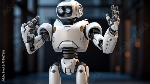 a robot standing upright with his arms raised