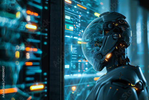 A robot with a helmet on looks at a computer screen