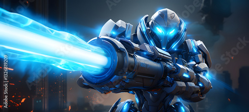 A robot with blue eyes and dashing, wielding a large bazooka and laser sword, ai generative