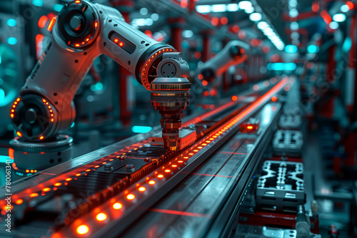 A robotic arm controlled by AI algorithms, performing precise tasks in manufacturing or assembly lines. Concept of robotic automation and industrial applications. Generative Ai.