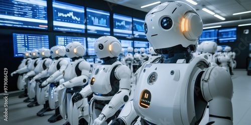 A robotics lab filled with advanced AI-powered machines, where engineers and scientists monitor data on large screens, optimizing the robots' learning and performance.