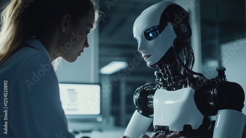 A robotics researcher programming a humanoid robot to mimic human expressions in a tech lab