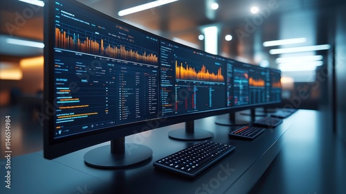 A row of computer monitors displaying data analytics and statistics in a modern workspace.