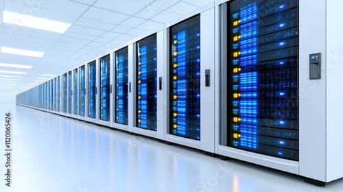 A row of server racks in a data center, showcasing technology.