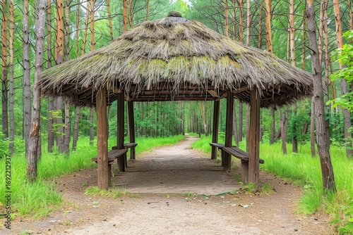 A rustic shelter with a thatched roof stands along a winding path, surrounded by lush greenery and tall trees in a serene forest setting.