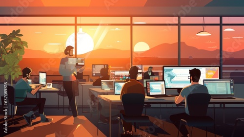 A scene showcasing a team of software developers coding, collaborating, and testing applications in a modern development environment