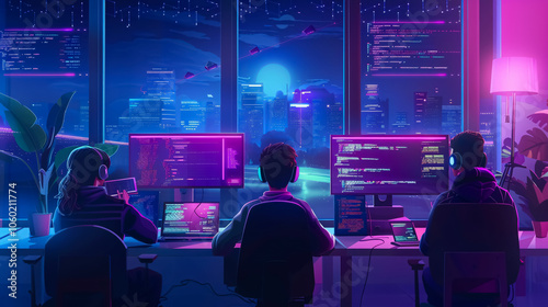 A scene showcasing a team of software developers collaborating, coding, and testing applications in a modern development environment.