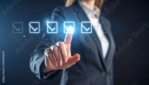 A scene where a man in a suit selects from a virtual checklist floating in the air