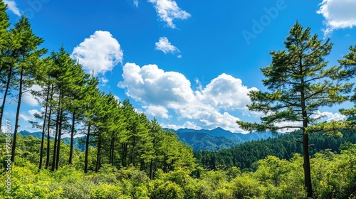 A scenic view of tall green pine trees under a bright blue sky in Japan, with the lush forest stretching towards the horizon. Perfect for nature and landscape photography.