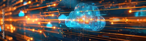 A science fiction scene where cloud networking is visualized as a sky filled with interconnected microcircuit patterns, pulsing with data flow