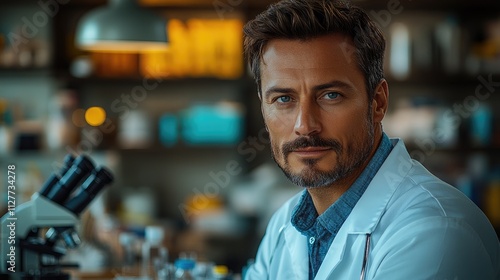 A scientist in a lab coat poses thoughtfully in a laboratory setting with a microscope.
