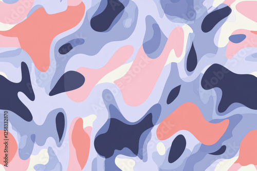 A seamless abstract pattern with fluid organic shapes in lilac, chambray blue, and peach fuzz. Smooth transitions, soft textures, and modern, playful energy. A trendy 2024 color palette with a stylish