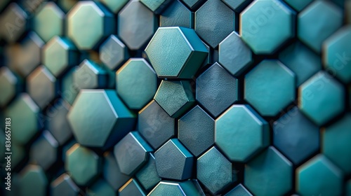 A seamless pattern of interlocking hexagons in varying shades of blue and green with a gradient overlay, creating a sense of depth and complexity. Minimal and Simple,