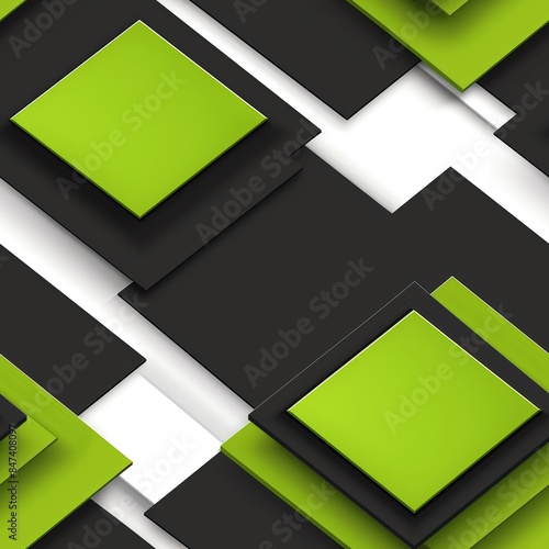 A seamless pattern tile of geometric shapes and squares in green, black, and white.