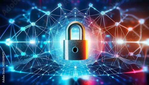 A secure network with connected nodes and digital locks, vibrant and modern business