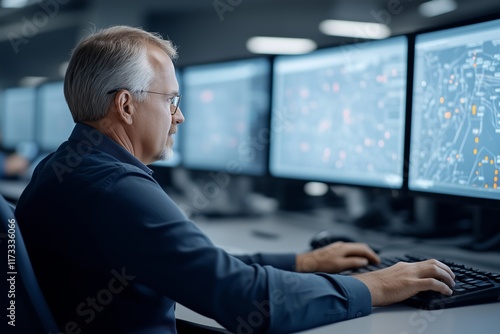 A senior engineer with gray hair analyzes detailed traffic patterns displayed across multiple high-resolution digital screens in a control room.