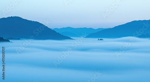 A serene, cool blue mist gently shrouding a distant natural landscape, creating a calming, ethereal atmosphere. Perfect for backgrounds ,overcast ,minimalist ,haze