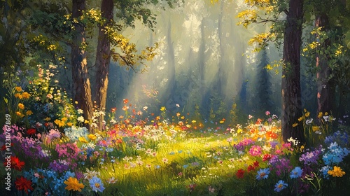 A serene forest scene bathed in soft, golden light, featuring a vibrant array of wildflowers blooming in various colors such as pink, yellow, red, and blue. Towering trees with lush green leaves frame