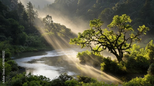 A serene landscape of a river, trees, and misty mountains.