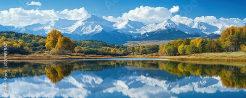 A serene mountain lake reflecting the snow-capped peaks that surround it.