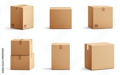 A set of brown cardboard boxes stacked, simple packaging concept, photorealistic style, isolated on white background
