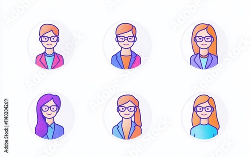 A set of simple portrait icons with a round background and front view, featuring men and women in business attire.