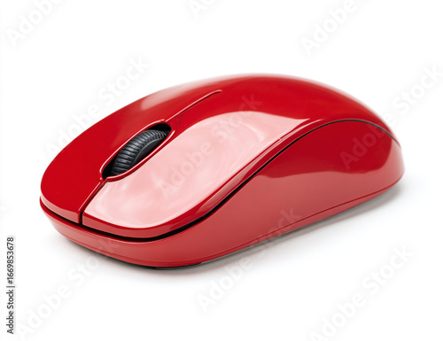 A shiny red computer mouse with a scroll wheel isolated on white background