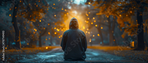 A silhouette man sitting on street on empty park at night
