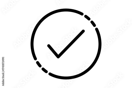 A simple black and white checkmark inside a dashed circle, isolated on transparent background