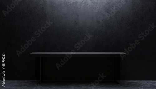 A simple black table with a rectangular top and thin legs stands in front of a dark-colored textured wall.