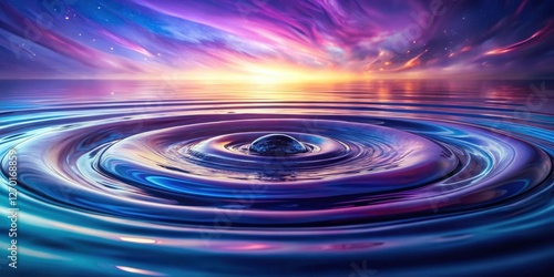 A single drop creates mesmerizing concentric ripples on a tranquil body of water, reflecting a vibrant, cosmic sunset