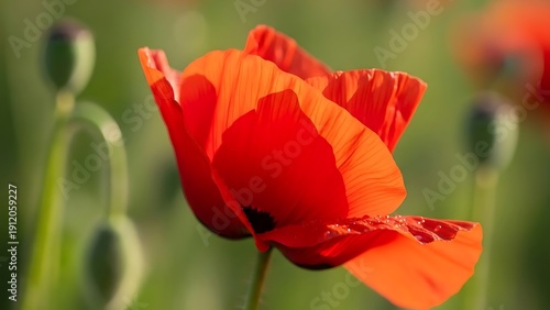 A single red poppy with water droplets in a green field with blurred buds flower bloom