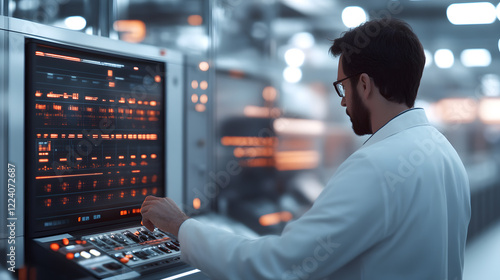 A skilled factory operator adjusting the controls of a high-tech production line. The individual focuses intently on a digital display screen as machinery processes materials in the background.