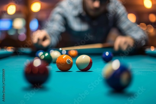 A skilled player focuses intently as he lines up his shot on the sleek green baize, surrounded by the lively energy of the recreation room's pool table and billiard balls